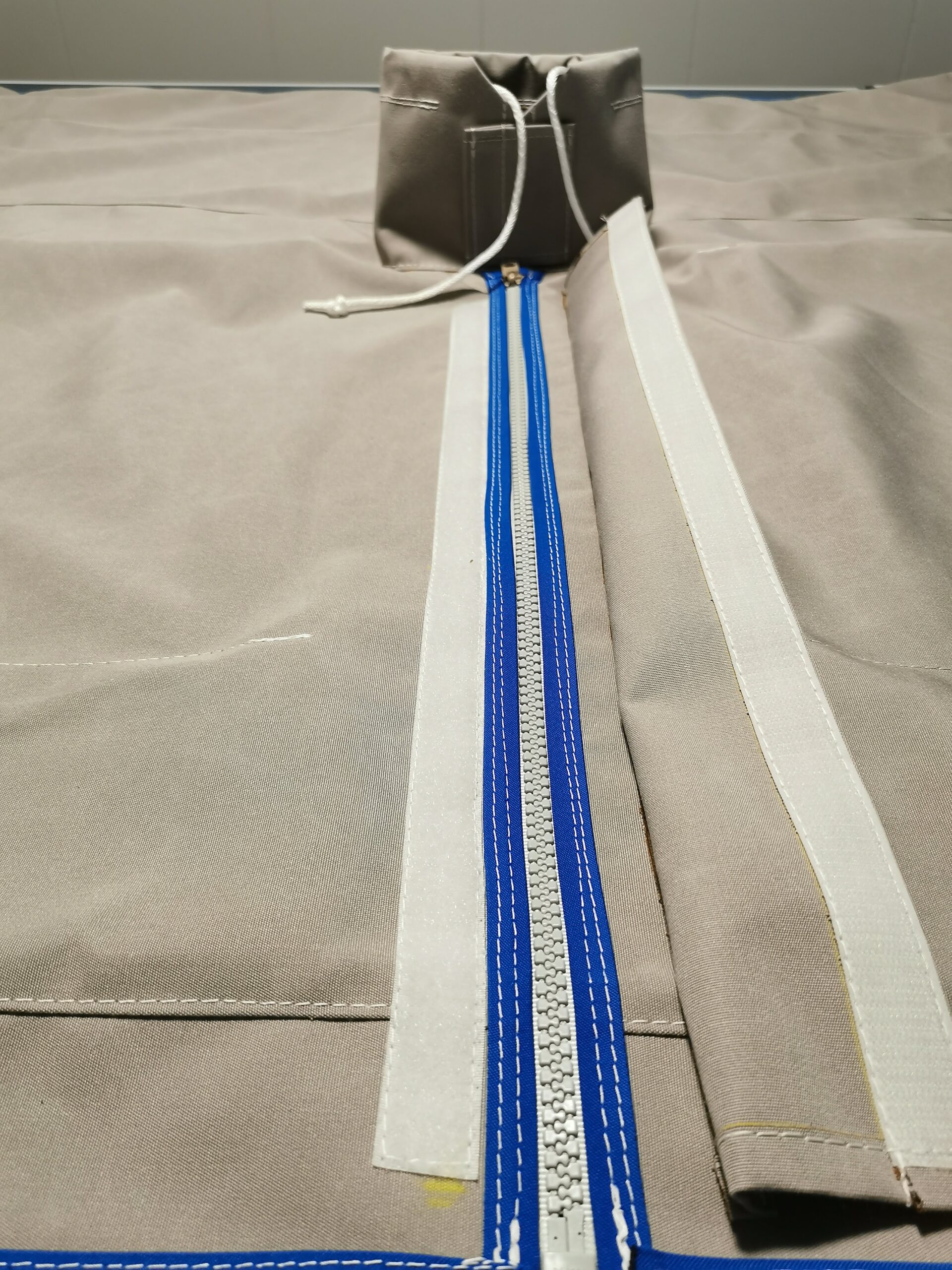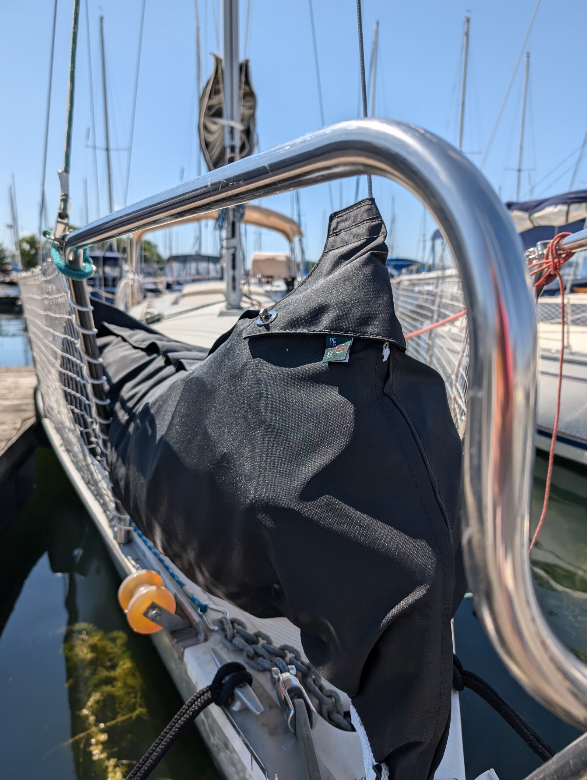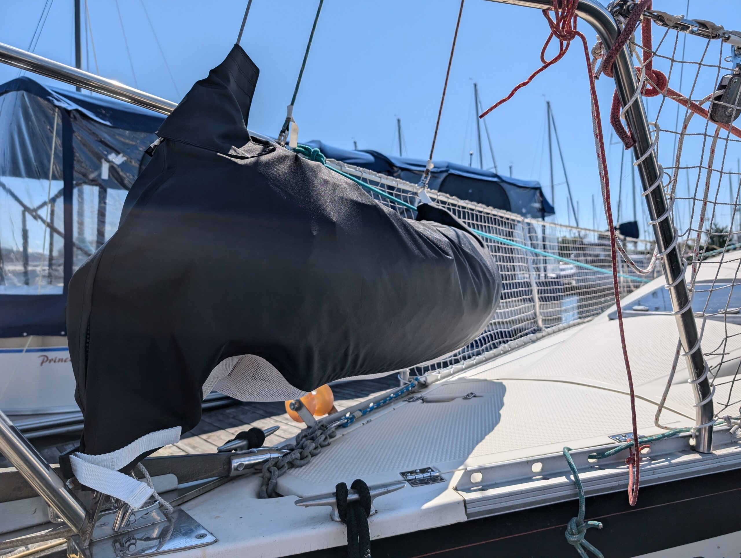 Sac de pont pour entreposage pratique de la voile d’avant. Un grillage sur le dessous permet l’évacuation de l’eau et humidité. Un zipper sur le dessus et un sur l’avant permettent un accès facile pour le rangement.