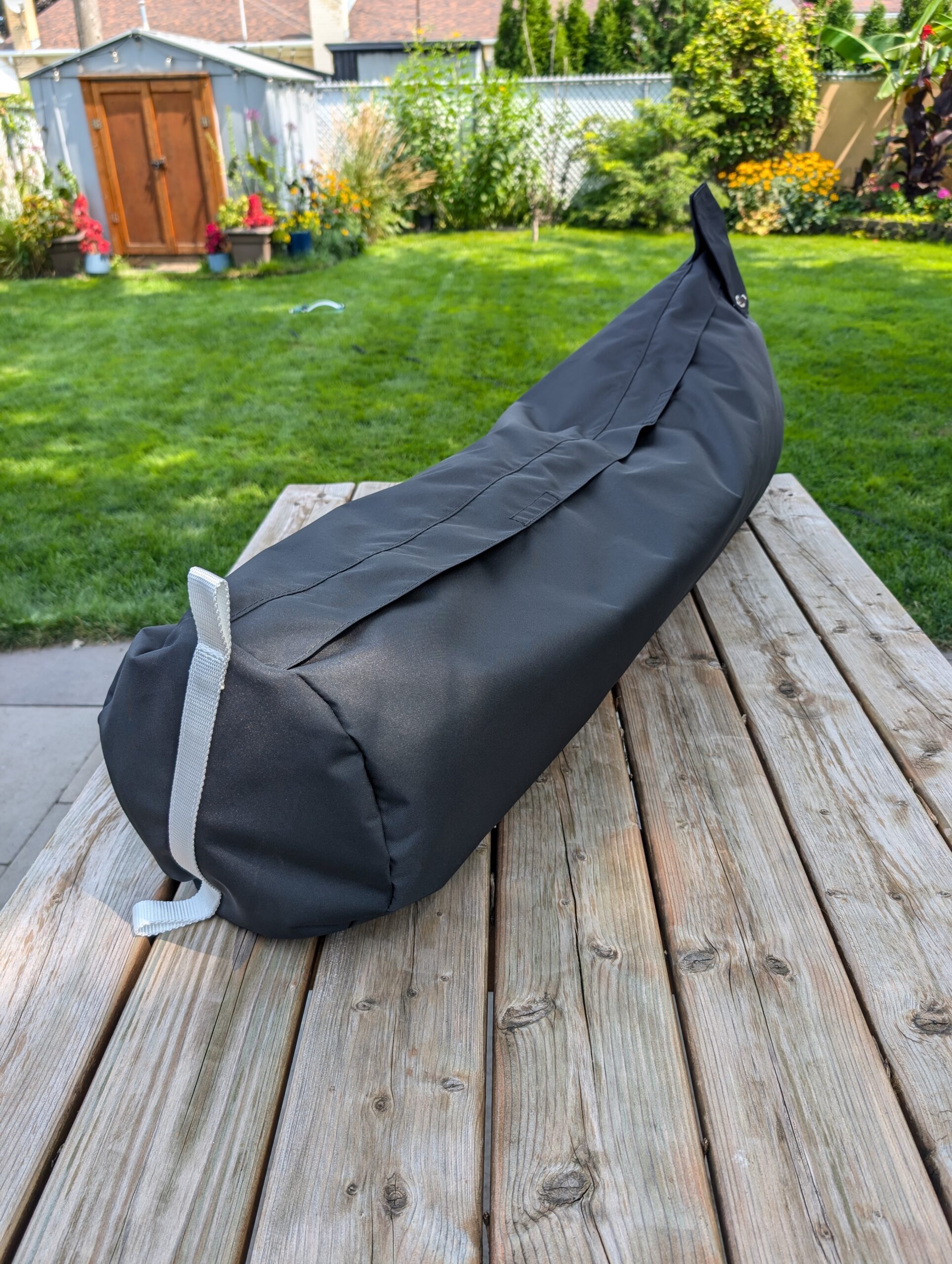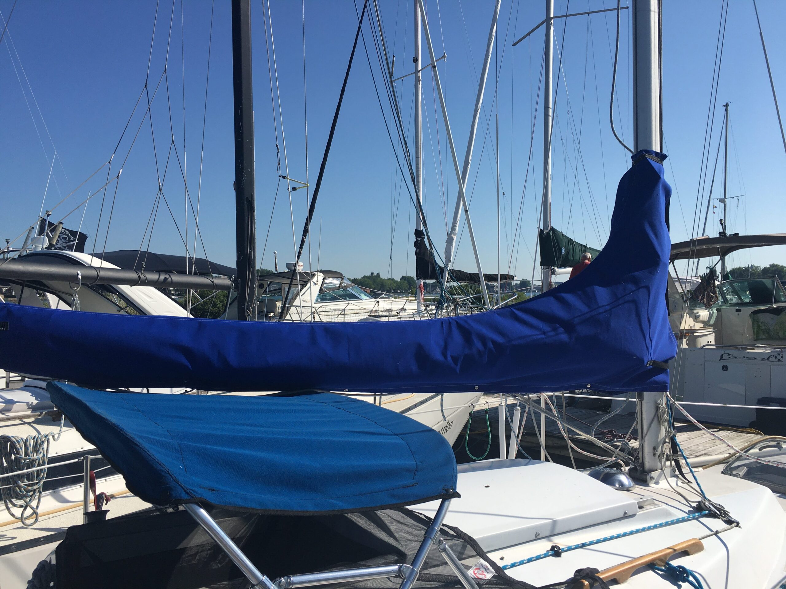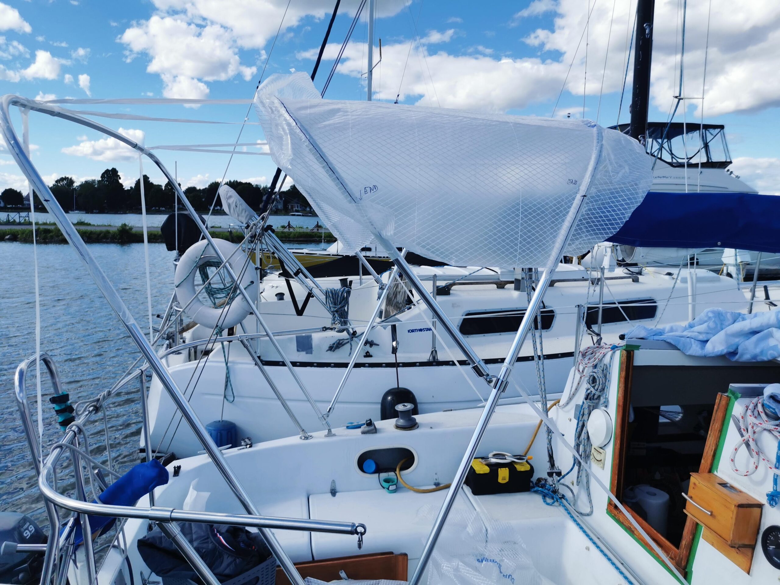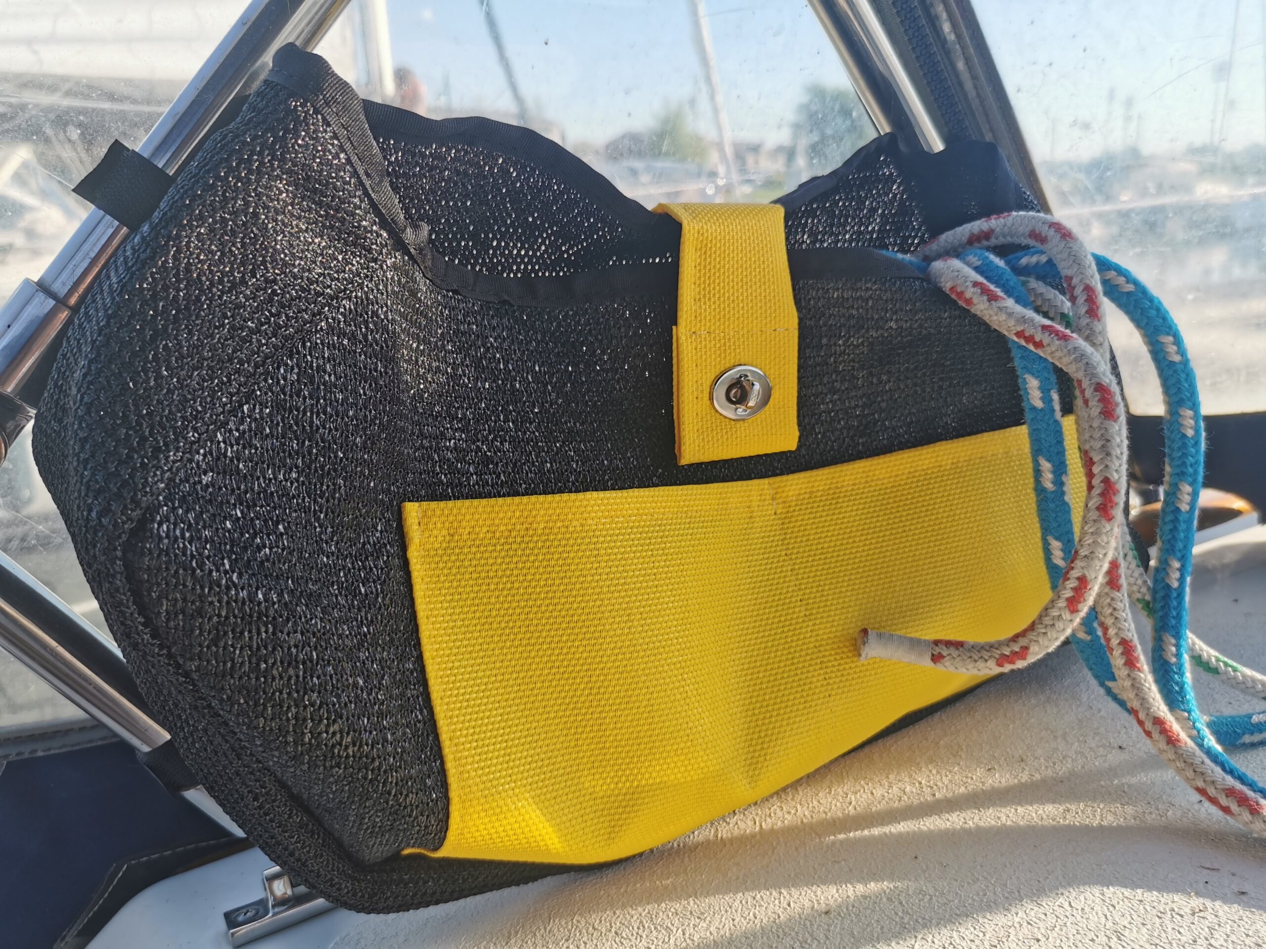 Sac de pont pour entreposage pratique de la voile d’avant. Un grillage sur le dessous permet l’évacuation de l’eau et humidité. Un zipper sur le dessus et un sur l’avant permettent un accès facile pour le rangement.