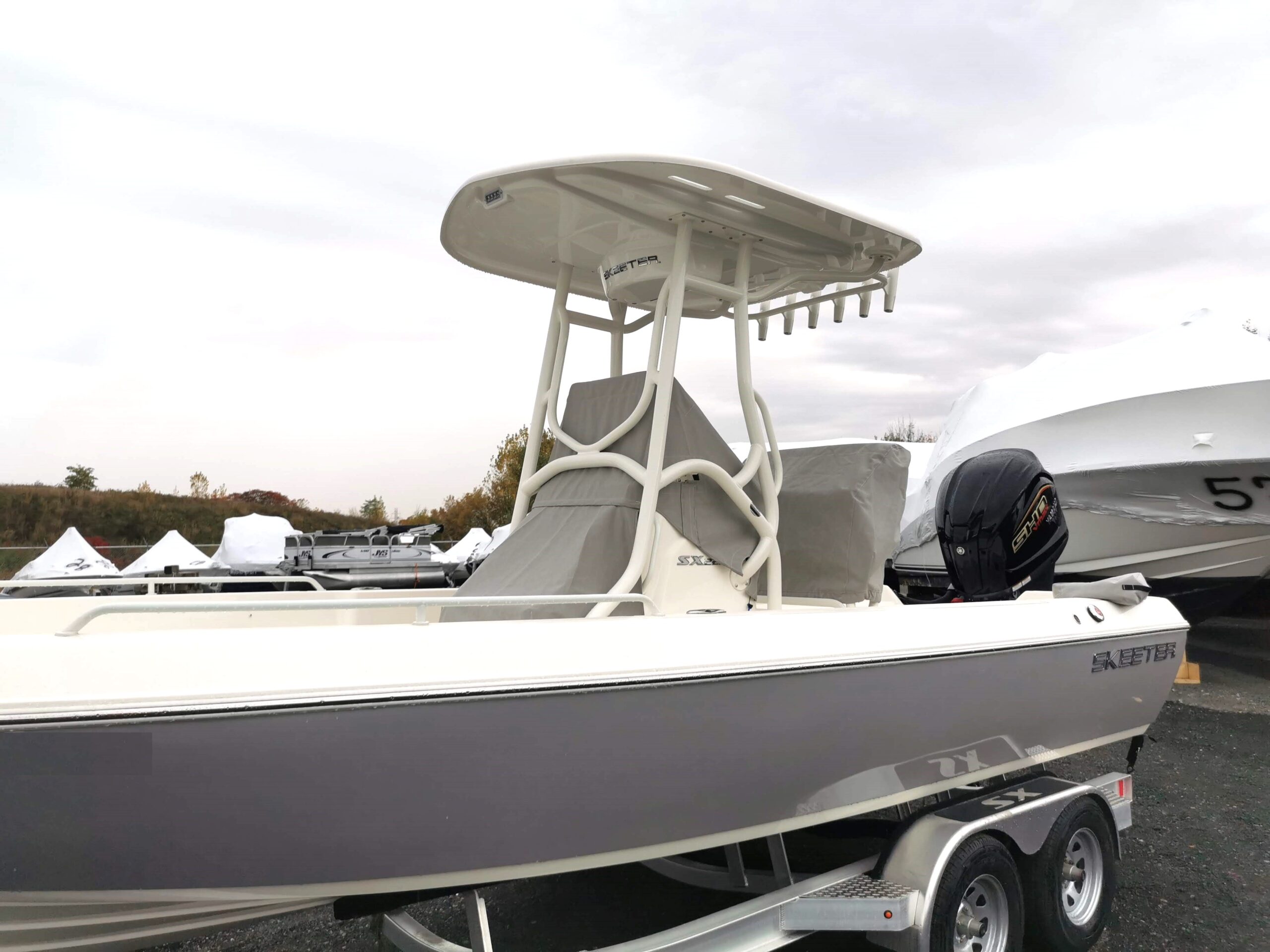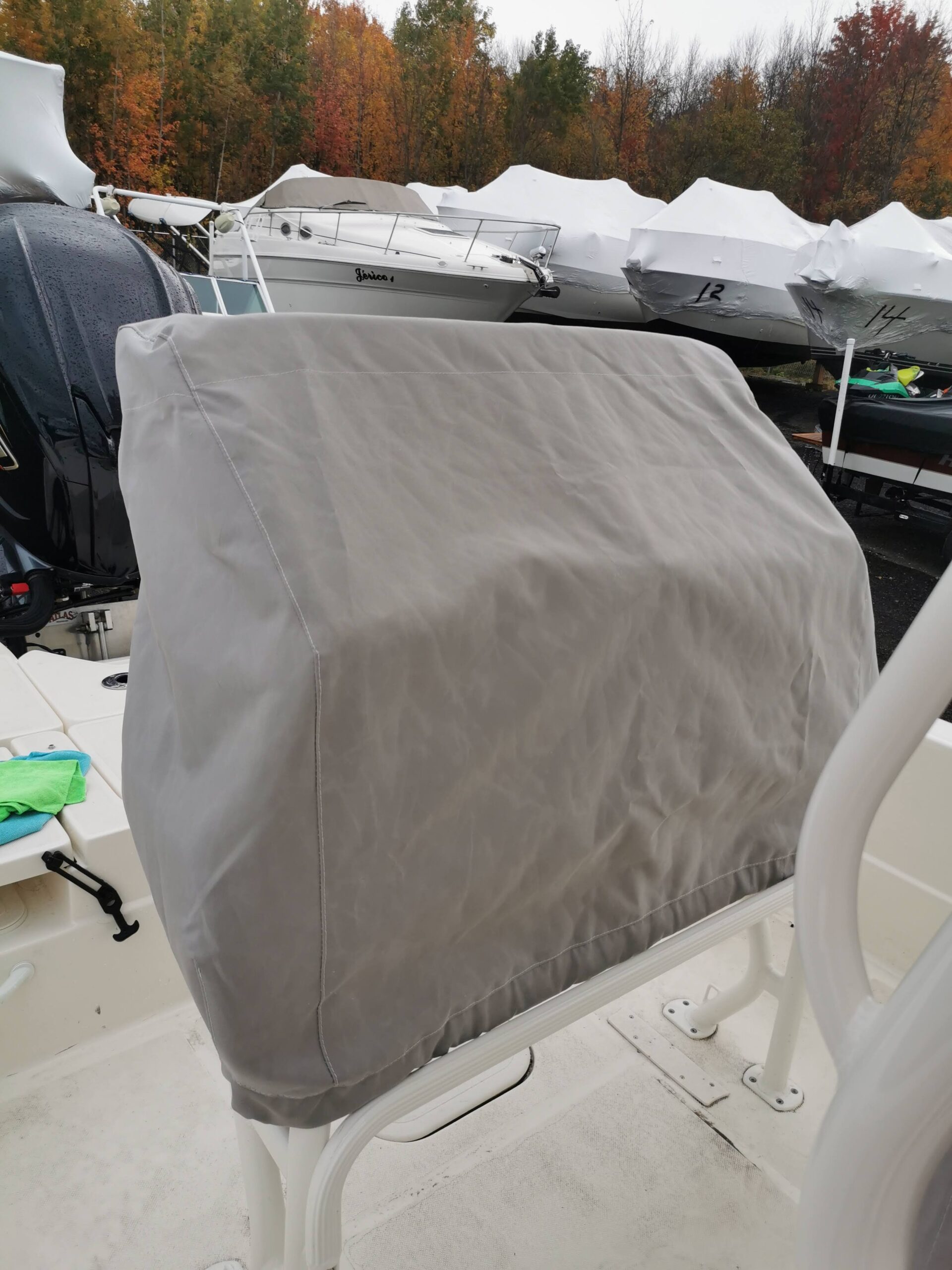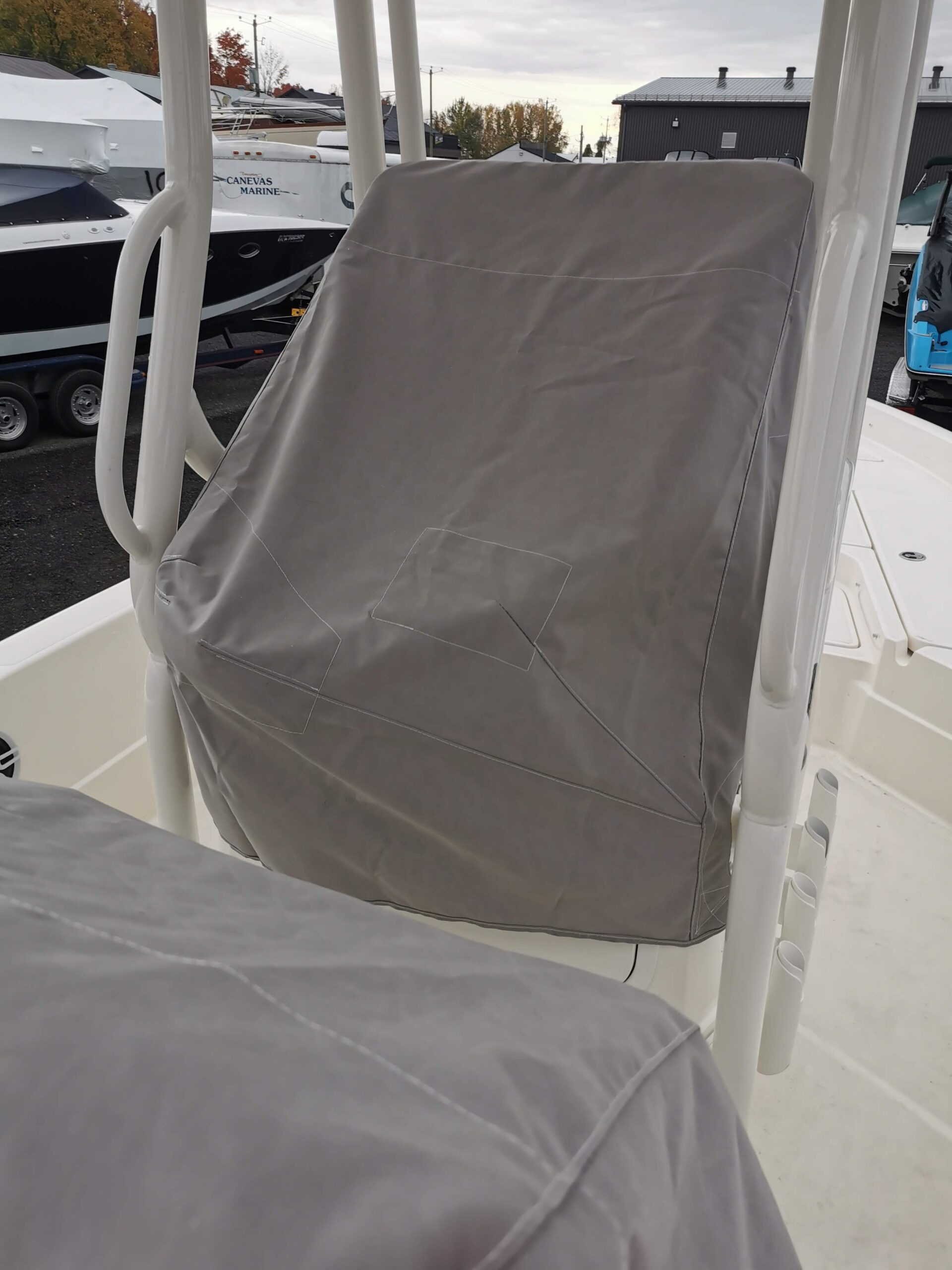 Toiles de protection en Sunbrella pour la console et les bancs d’un bateau de pêche.